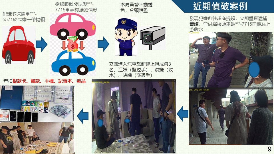經詢黃嫌坦承擔任詐欺車手,且供稱***-7715號自小客車駕駛即為上游收水,警方隨即至***-7715號藏匿地點汽車旅館執行查緝,發現江嫌(監控手)、洪嫌(收水手)、胡嫌(交通手)在內,且分別持有海洛因、安非它命、依托咪酯及愷他命等毒品,即以涉嫌刑法詐欺罪、洗錢防制法及毒品危害防制條例案現行犯逮捕,並查扣金融卡12張、贓款2萬元、手機6支、筆電1台、帳冊1本及毒品等贓物,全案皆依刑法詐欺罪、洗錢防制法、毒品危害防制條例等罪嫌移送偵辦,並擴大追查詐欺集團其他成員。