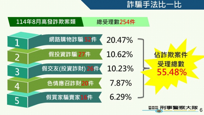 在打擊詐欺犯罪部分,114年嘉義縣警察局執行3波全國同步打擊詐欺行動專案及114年1至8月份查緝集團詐欺成效共查獲詐欺集188團1089人,查扣不法利得總值1億8,283萬9,856元。攔阻詐欺件數部分,統計114年1至8月份則有121件、6,890萬8,148元,較 113年同期增加6件、310萬0,833元;在詐欺犯罪發生趨勢部分,根據打詐儀錶板分析,嘉義縣今年8月份詐欺案件受理數254件,財損金額新臺幣6,010萬7,139元,與114年7月份數據相比較,受理件數增加25件(+10.91%)、財損金額減少1,811萬9,408元(-23.16%);以詐騙手法分析,則以「網路購物詐騙」詐騙計52件最多(占20.47%)、「假投資」詐騙計27件次之(占10.62%)、「假交友(投資詐財)」詐騙計26件再次之(占10.23%),網路購物詐騙案件已有明顯竄升趨勢,位居高發案類冠軍,惟投資詐騙(含假交友投資)在財損部分依然位居各類手法首位,占財損總額60.35%,提醒民眾投資前務必謹慎查證,切勿輕信不實廣告,以免誤墜詐騙陷阱!