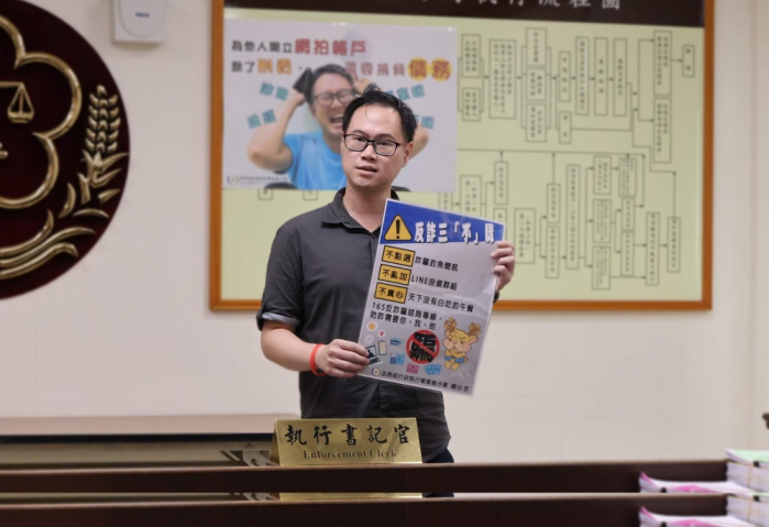 【記者張文一嘉義報導】行政執行署嘉義分署114年第4次123擴大聯合拍賣會,當日除了上下午雲林、嘉義二地有不動產拍賣外,更在下午於嘉義分署門前廣場進行動產拍、變賣活動。因詐騙犯罪行為層出不窮,分署行政執行官於拍賣前進行反詐騙宣導 ,陳列反詐騙海報向到場民眾介紹有關詐騙手法及「反詐騙165專線」,希望民眾切忌貪便宜心態避免被詐騙。