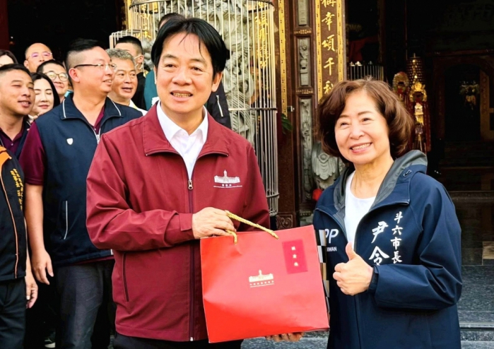 【記者陳信利/雲林報導】總統賴清德今天(18日)下午由雲林縣長參選人劉建國立委、斗六市長參選人尹令瑛等人陪同,前往虎尾福安宮「糖廠媽」、斗六石榴班長和宮「斑鳩媽」參香祈福並發放福袋。