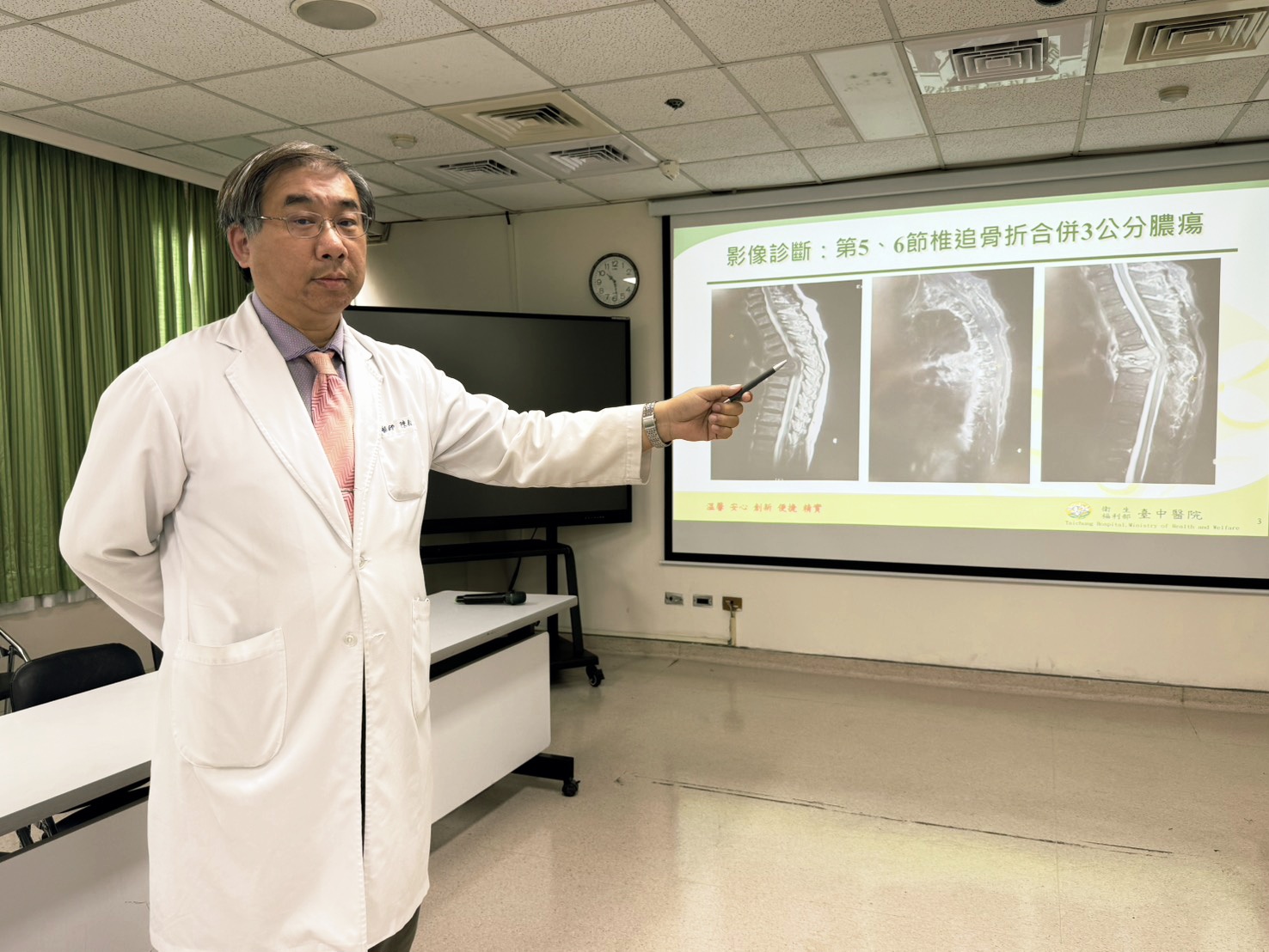 圖:衛生福利部臺中醫院神經外科陳典廷主任說明,患者胸椎第五、六節間出現三公分感染性大膿包壓迫神經導致疼痛