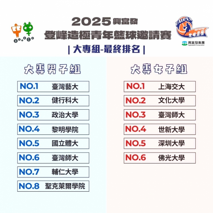 【記者陳信利/綜合報導】2025興富發登峰造極籃球公益賽今天(27日)圓滿落幕,臺灣藝大三劍客王威翔、徐堂琪、菲尼克斯等合砍63分,臺藝大以86比81力克健行科大,首度在大專組封王;文化大學只以86比74贏了上海交大12分,屈居大專女子組亞軍,輸球的上海交大還是奪冠!