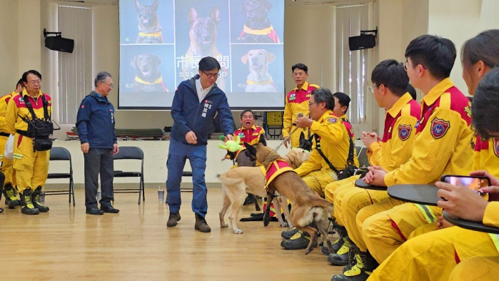 陳其邁說,「同島一命、民力無窮」,很多帶著鏟子的英雄投入救災,甚至擠爆火車站,「印證台灣最美麗的風景是人」,那麼多愛心人士,還有搜救大隊辛苦救災,令人十分感動。後續陳其邁頒發慰問金,感謝高雄特搜大隊無私付出,並送上玩具與零食慰勞5隻搜救犬,肯定牠們在災區日夜努力。
