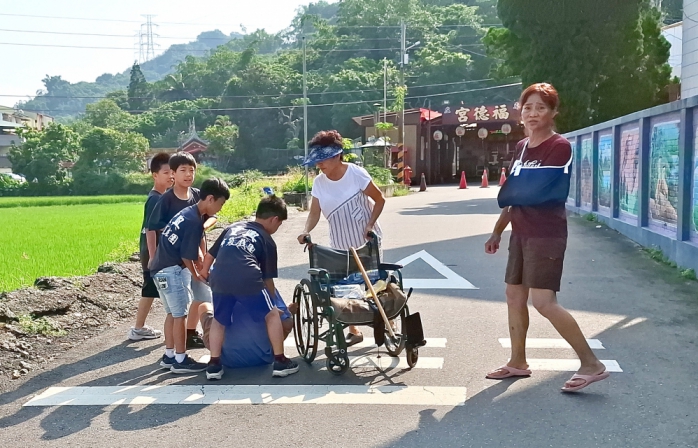 學童們昨天在前往敬老表演路上,突然看到一位老人從輪椅跌倒在路上,學童們連忙下車,一起幫忙扶起老人坐回輪椅,並協助推著輪椅送老人到他要去的地點,再回到下一場關懷巷弄站表演,學童們的愛心令家屬感激不已!