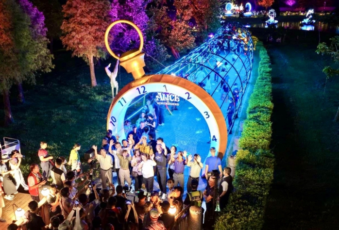 【雲嘉特派員陳信利/嘉義市報導】2025嘉義市「光織影舞」系列活動今天(4日)在北香湖公園璀璨登場。今年以「光影夢境」為主題,結合迪士尼經典動畫《愛麗絲夢遊仙境》,打造8大沉浸式展區。