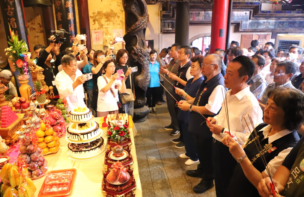 【雲嘉特派員陳信利/嘉義縣報導】新港奉天宮今天(6日)舉辦「開台媽祖契子女中秋回宮團圓祈福典禮」,全國各地契子女與信眾齊聚一堂團圓參拜,嘉義縣長翁章梁、新港鄉長葉孟龍及奉天宮董事長何達煌等人,一同切蛋糕慶祝中秋佳節、慶團圓。