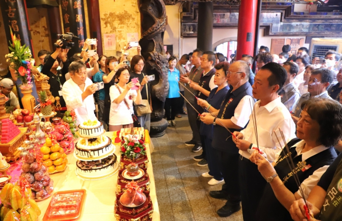 今天典禮在祈福團拜後,由契子女合照、切蛋糕,並分享象徵「平安團圓」的平安圓、「富貴綿長」的長壽麵、「金銀財寶」的元寶水餃及大蛋糕,氣氛熱絡。(圖/奉天宮提供)