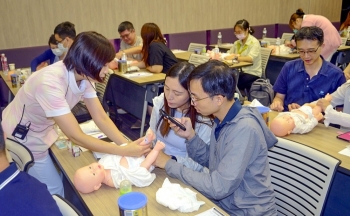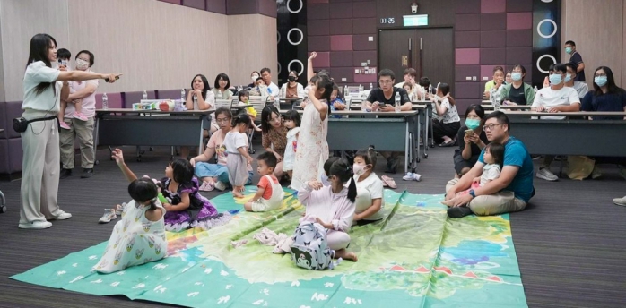 小朋友在繪本共讀中聽故事,與爸媽一起沉浸親子互動樂趣裡,育兒教室座無虛席,專業講師透過實作示範帶領新手爸媽,練習照護技巧,有爸爸笑著說,「終於敢幫寶寶換尿布了。」