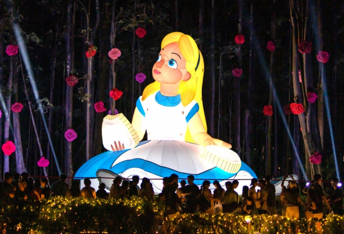 市長黃敏惠表示,今年「光織影舞」以迪士尼經典動畫《愛麗絲夢遊仙境》為主題,打造八大夢境展區,從9公尺高的愛麗絲主題裝置、湖面上緩緩轉動的月亮,到30公尺長的光環隧道,呈現奇幻又浪漫的沉浸式體驗。