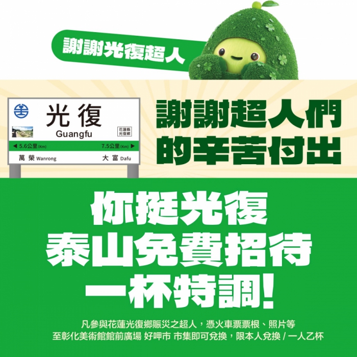 泰山說,花蓮光復鄉水災,從全國各地前往救災的40萬名志工,受到全民的敬佩,總統賴清德更在國慶演說上大為讚揚,為此,泰山特推出「謝謝光復超人」回饋方案,凡參與花蓮光復鄉賑災的志工和國軍英雄,憑火車票根或參加照片,即可在現場免費兌換一杯特調飲品,限本人兌換,一人一杯,藉此向超人致上最誠摯的感謝。