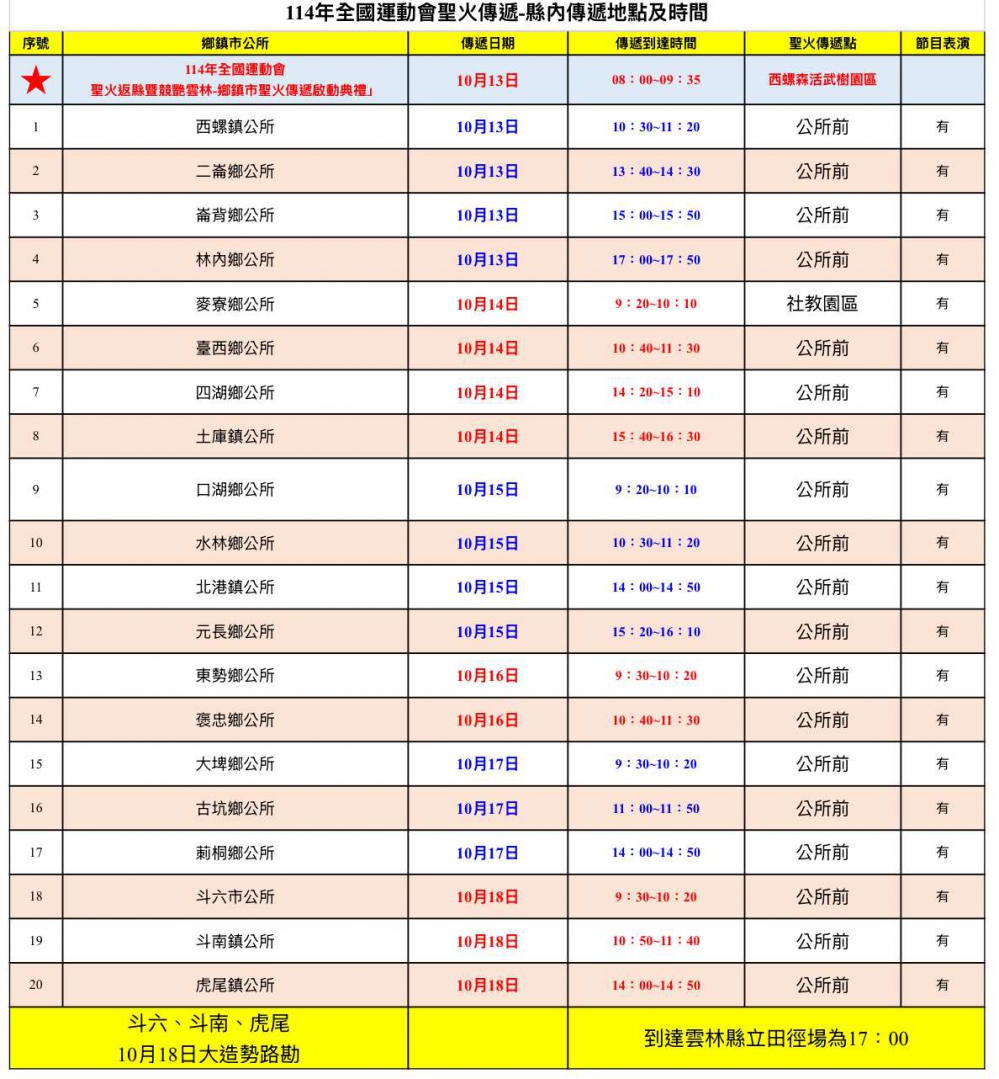 ・10月18日:斗六市公所(09:30–10:20)、斗南鎮公所(10:50–11:40),以及虎尾鎮公所(14:00–14:50)。