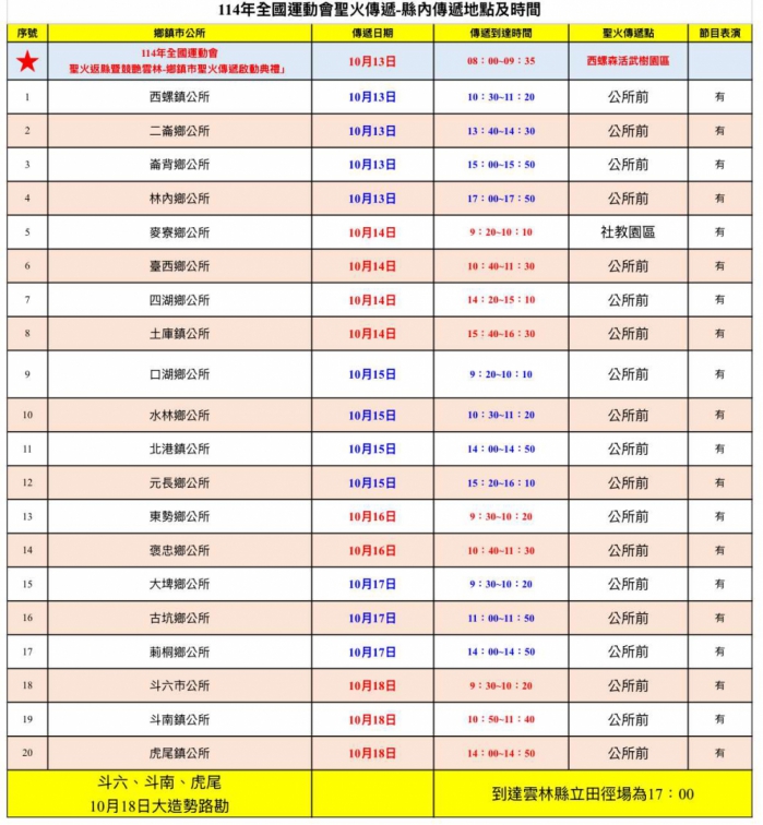 聖火將於10月18日17點抵達雲林縣立田徑場,並在此盛大舉辦「大造勢活動」,邀請全縣民眾一同見證這場體育盛事的最終準備。
