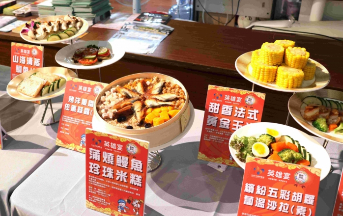 魏處長表示,菜單有蒲燒鰻魚珍珠米糕、炙燒豚香三色馬鈴薯慕斯小堡、菜頭粿、冰火雙享蜜香烤地瓜、焦糖蜂蜜醬佐南瓜、胡麻醬拌嫩雞胸、青木瓜輕拌蝦仁越式沙拉、蒜香醬燒排骨、琥珀香脆烤鴨。