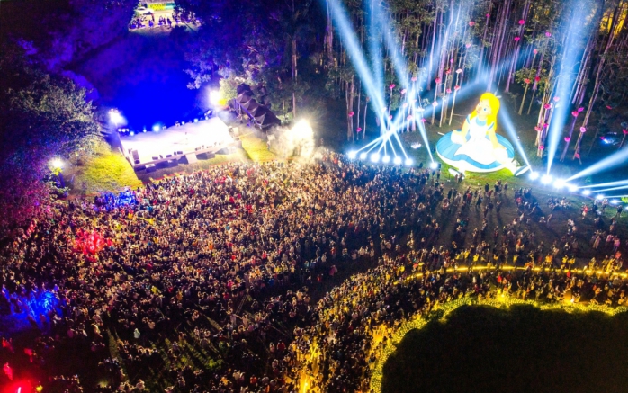 市政府觀光新聞處處長張婉芬表示,今年光織影舞以迪士尼經典動畫《愛麗絲夢遊仙境》為主題,展區設計兼具白天與夜晚之美。白天陽光灑落湖畔,巨型愛麗絲氣偶倒映水中,湖光與藍天構成夢幻景致。