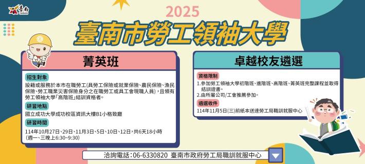 【記者蔡俊賢/台南報導】為落實市長黃偉哲「希望家園」施政願景,協助在職勞工持續精進專業能力,臺南市政府勞工局與國立成功大學合作辦理的「勞工領袖大學階梯式課程」邁入第15年。今年(114年)「勞工領袖大學菁英班」將於10月27日在成功大學成功校區小格致廳開課,歡迎符合資格的勞工朋友踴躍報名參加(洽詢電話:06-6330820)。