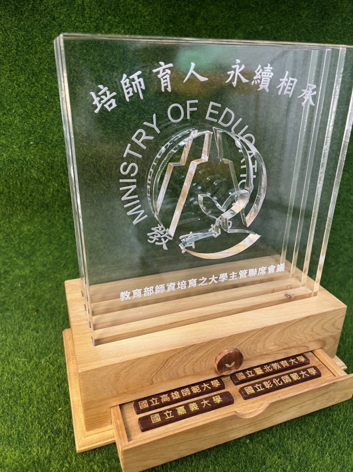 會議閉幕式的交接信物由嘉義大學林翰謙校長親自設計,以肖楠木為底座並刻記樹苗象徵教育萌芽,上方堆疊透明壓克力透亮清澈,寓意世代傳承與教育延續的厚度與光明,結合木材的自然溫厚與壓克力的現代視野,融合傳統與創新,彰顯師資培育的厚植根基、承傳使命與開創未來的精神。並由彰化師範大學陳明飛校長接下信物,正式宣布下屆會議將移師彰化師大舉辦,象徵師資培育工作持續傳承與精進。