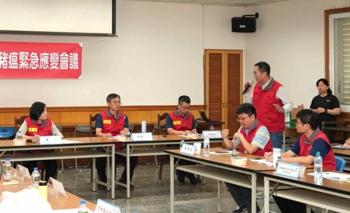 非洲豬瘟緊急應變會議今天在動植物防疫所三樓會議室舉行。由指揮官張麗善縣長主持,副縣長謝淑亞、秘書長曾元煌,縣府各局處人員、海巡署、肉品市場等相關單位均參加。