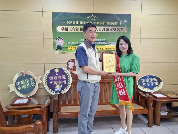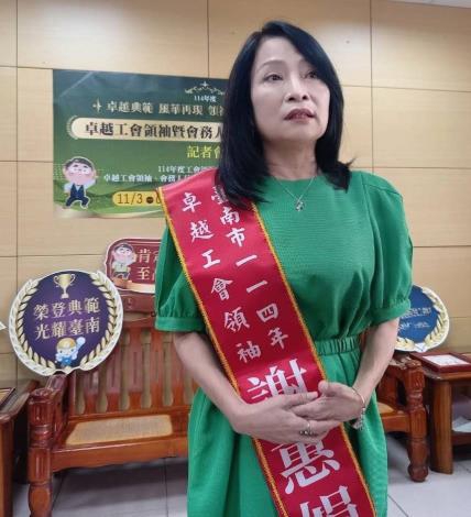 台南市運動場所服務職業工會理事長謝惠娟;自民國98年創立工會起,謝惠娟理事長已累積逾16年領導資歷,並擁有經營管理與法學雙碩士學位。她推動工會導入勞動部TTQS人才發展品質管理系統,榮獲全台首家健身運動訓練機構TTQS銅牌,成為專業訓練品質的象徵。除提升會員專業能力外,亦積極擔任「勞動法令校園宣導講師」,推廣正確勞動知識至校園與企業,同時結合社區資源,在日照中心提供健身訓練,展現對弱勢族群的關懷。