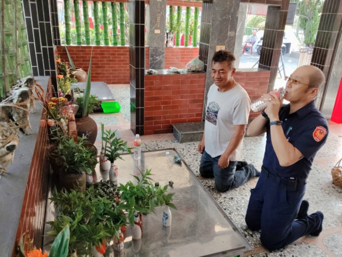 【記者蔡俊賢/台南報導】全台唯一供奉平埔族祖靈「阿立母」的警察單位—臺南市警察局白河分局東河派出所,於24日上午在東山區吉貝耍公廨舉辦「阿立母回娘家」儀式。所長江崇鎰與地方耆老吳火生共同迎請阿立母返大公廨觀戲,並將參與夜祭、孝海祭等傳統儀式,祈求風調雨順、地方安康、社區平安。