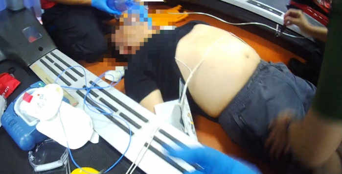 蘭潭分隊隊員邱政諭、李承諺、李易融及志工蕭郁芬抵達現場時,1名患者(男性、54歲)倒臥在跑步機旁,運動中心人員表示,患者使用跑步機時突然倒地失去生命徵象,立即撥打119求救,並依照119線上DA-CPR通話指導,迅速施行心肺復甦術,並使用PAD電擊2次,爭取黃金搶救時間。
