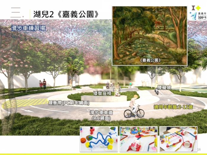 同時依據小朋友們的期待,建置滑梯、秋千、滑步車練習場等遊具與場域,更融合在地文化意象及陳澄波老師畫筆下的嘉義風光發想,打造兼具藝術、美學與休憩功能的都市綠地。