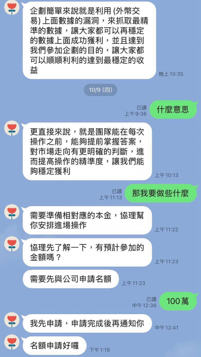 嘉義市警方深入偵辦發現,這些詐騙集團先以「公務機關」名義取信民眾,用「免費課程」當作誘餌,民眾一旦加入Line好友,隨即會被引導至假投資群組或平臺,謊稱可利用交易平台漏洞賺取高倍率報酬,並可獲取每月穩定配息,僅需將現金兌換成虛擬貨幣再入金給團隊代為操作即可。