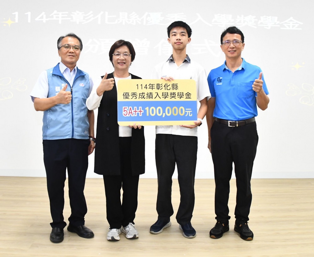 縣府在和美高中舉辦「114年度國中會考優異學生獎學金頒贈典禮」,由縣長王惠美頒發73萬元獎學金,給23名優秀學生,王縣長表示,有23人符合資格,其中5A++有1人,獎金10萬元,5A有3人,(每人5萬元)、4A1B有10人,每人3萬元),3A2B有9人,每人2萬元,較去年18人受獎,今年增加5人。