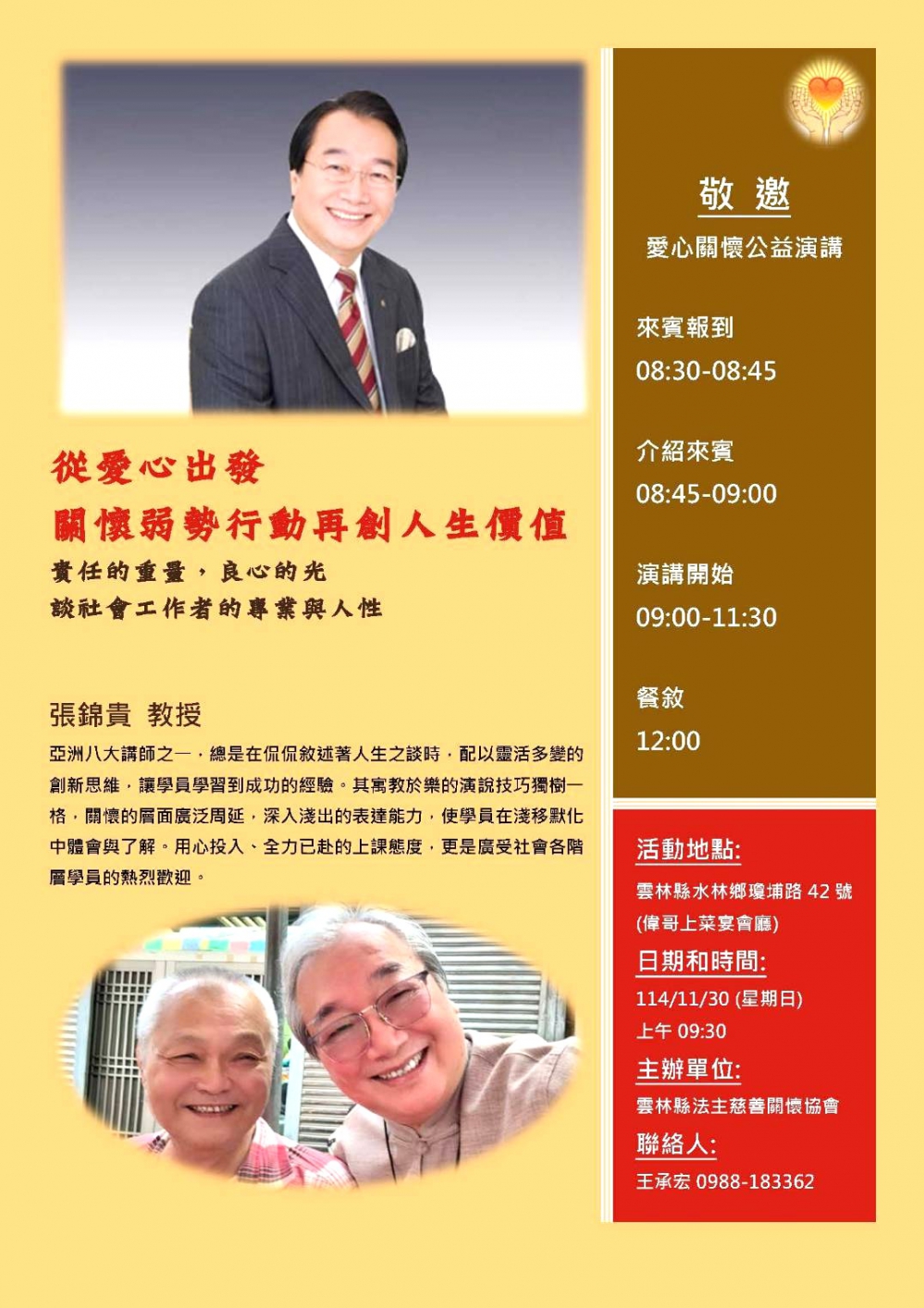 【記者陳信利/雲林報導】雲林縣法主慈善關懷協會將於11月30日(周日)上午8時30分,在水林鄉「偉哥上菜宴會廳」,舉辦一場意義深遠的公益演講活動,特別邀請亞洲八大講師之一張錦貴教授主講。