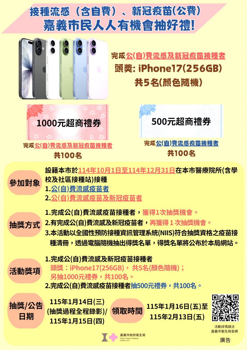 【雲嘉特派員陳信利/嘉義市報導】嘉義市政府為鼓勵市民踴躍接種疫苗,提升自身免疫保護力,由衛生局推出「打疫苗,抽好禮」活動,祭出iPhone 17手機5支,1,000元超商禮券及500元超商禮券各100個名額。