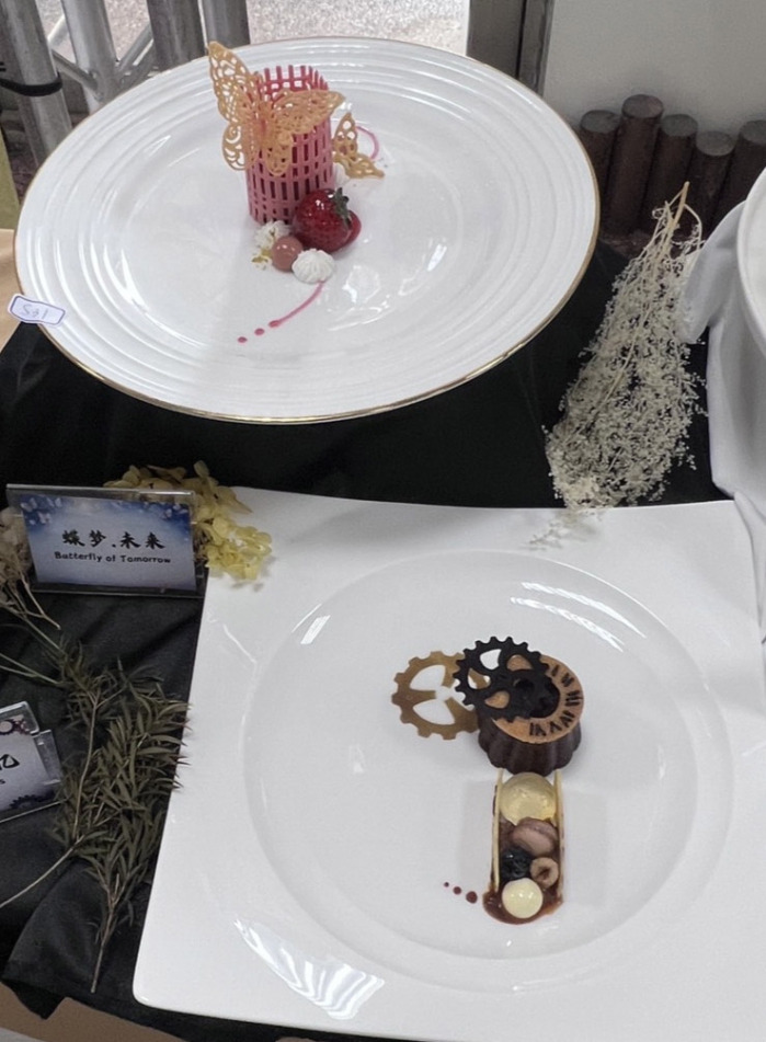 獲金牌的葉蔚諭同學為馬來西亞學生,她來台灣念烘焙,希望回國創業,獲獎的作品結合粉色蝴蝶,象徵夢想和成長,齒輪代表時間和努力,希望透過甜點傳達希望和蛻變的意象,這是她在烘焙道路上的學習心得。