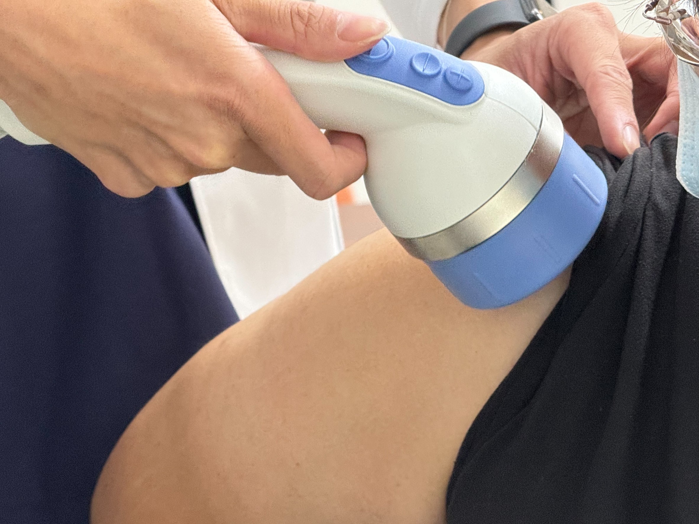 衛生福利部臺中醫院復健科蔡逸松醫師指出,患者就醫時原以為只是睡姿不良,到藥局買了止痛藥吃未改善,就醫接受x光與超音波檢查,才發現自己右肩四條旋轉肌中負責舉手功能的棘上肌鈣化,導致無法舉手,經消炎藥、熱療一個月效果未如預期,急著返回工作崗位的她嘗試用體外震波治療,幸運治療三周後大為改善,不但可以舉手還可以輕鬆操作剪刀設計髮型;目前使用體外震波治療需自費無健保給付。