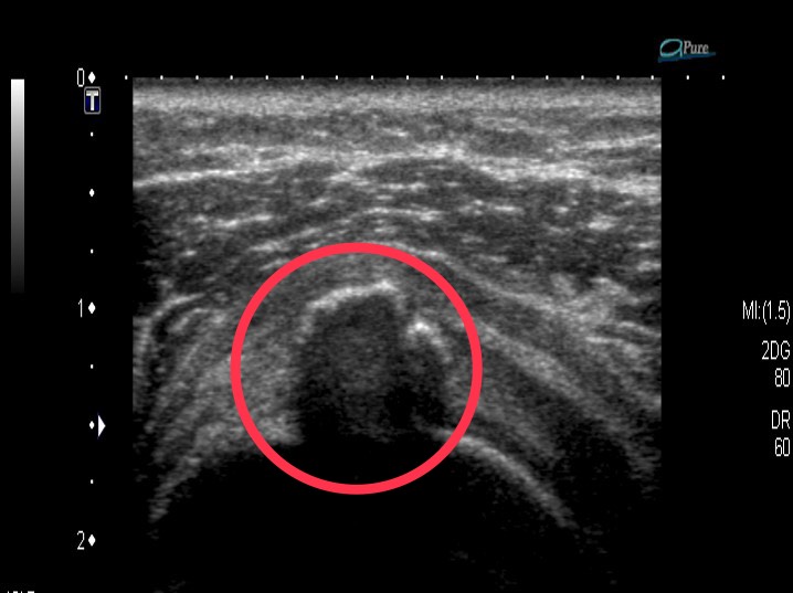 圖:圈起來為棘上肌,上方周邊亮光處即爲鈣化部位