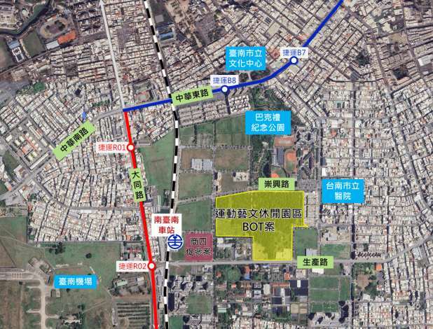 此案基地位於南臺南副都心區文教用地,面積約14.92公頃。周邊住商區土地開發逐漸蓬勃,基地鄰近臺南機場及預計於120年啟用的鐵路地下化南臺南車站,且周邊有捷運紅、藍線規劃站點,更增添基地通達性。此外,基地亦鄰近臺南市立文化中心、巴克禮紀念公園與市立醫院等,生活機能便利且臻成熟,藉由本案之規劃將本區域串連成生活消費圈。
