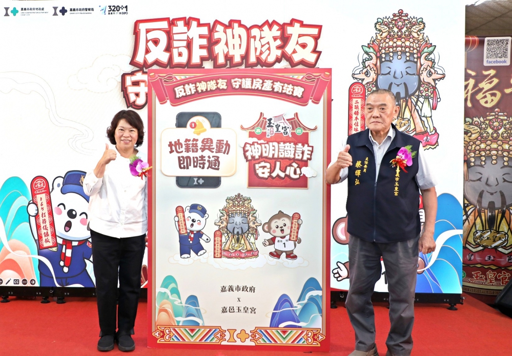 【雲嘉特派員陳信利/嘉義市報導】嘉義市政府地政處、地政事務所、市警局與嘉邑玉皇宮攜手合作,於今天(10日)在嘉邑玉皇宮舉辦「反詐神隊友,守護房產有法寶」聯合宣導記者會,市長黃敏惠、議長陳姿妏等人到場參與宣導,展現公私協力防詐的決心。