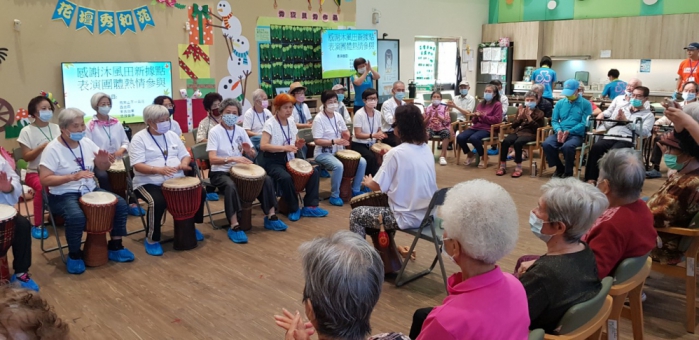 在音樂老師紀玲惠帶領下,沐風協會長輩精神奕奕敲擊非洲鼓和節奏樂器,演奏曲目和樂器「西北雨」非洲鼓合奏,「來去台東」手搖鈴歡唱,「烏來山下一朵花」、「甜甜圈」鈴鼓、啦圈互動,每首熟悉旋律,皆讓大家忍不住跟著哼唱,秀和苑長輩也隨節奏拍手,輕搖身體,會場充滿笑聲和共鳴。