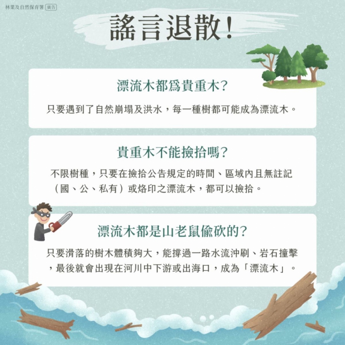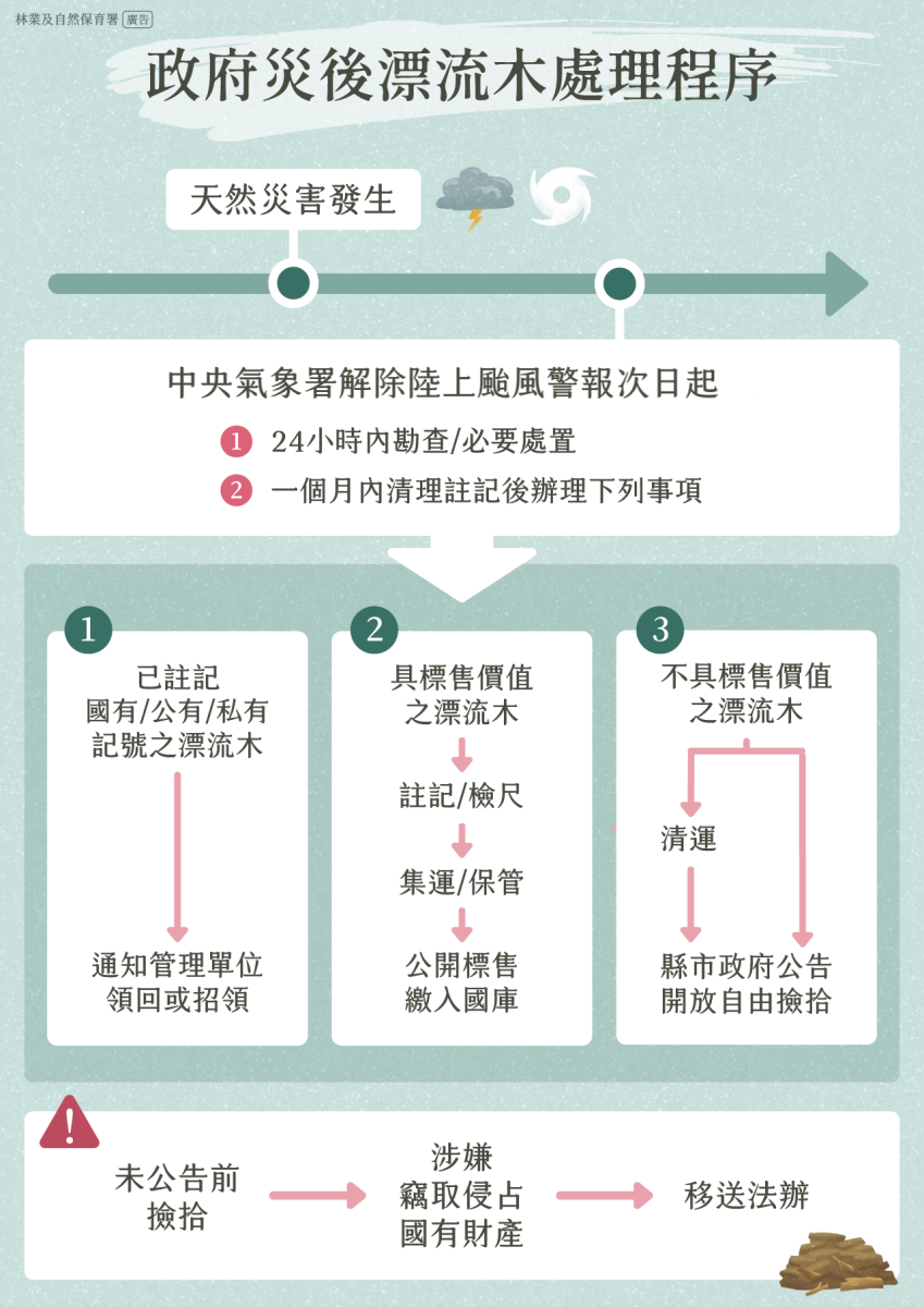颱風過後如需查詢漂流木清理、撿拾規定等資訊,可至林業及自然保育署「漂流木專區」查詢最新資訊,以確保自身權益並共同維護公共安全與環境資源,網址:https://www.forest.gov.tw/Driftwood。