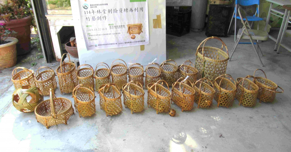 將林業剩餘資材轉化為可再利用的創作素材,並邀請竹掌竹編文化協會理事長吳文淼與邱鐘雪兩位竹藝專家指導授課。