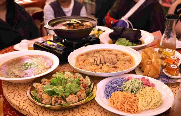 晚間宴席以品珍香麵包與順成油廠聯手的花生香吐司,以及海王子茶飲揭開序幕,再由阿海師鴨肉麵線、怪人花枝鱔魚羹、川龍食堂扁魚白菜、烏雞郎蒜頭薄荷烏骨夯雞、珍和蟹老闆結合萬源製麵舖推出的拳頭飯糰與涼麵等料理接續上桌。