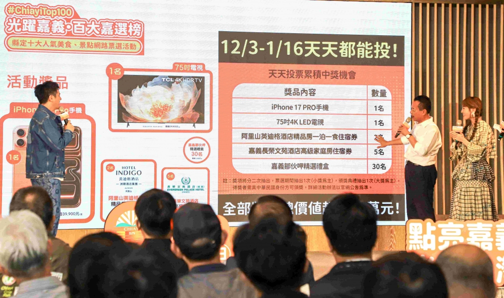 投票有機會抽中iPhone 17 PRO手機、75吋4K電視、阿里山英迪格酒店精品房一泊一食住宿券等大獎,還有嘉義縣長榮文苑酒店住宿券、嘉義鄒伙呷精選禮盒。明年1月2日抽出首波獎項,2月9日頒獎典禮將抽出最大獎。