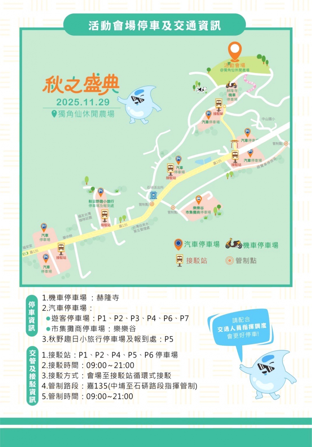 因應大眾交通需求,從中埔村往石硦村活動會場方向,沿135縣道設有7處汽車停車場、一處機車停車場及5處接駁站,請配合交通人員指揮停車。