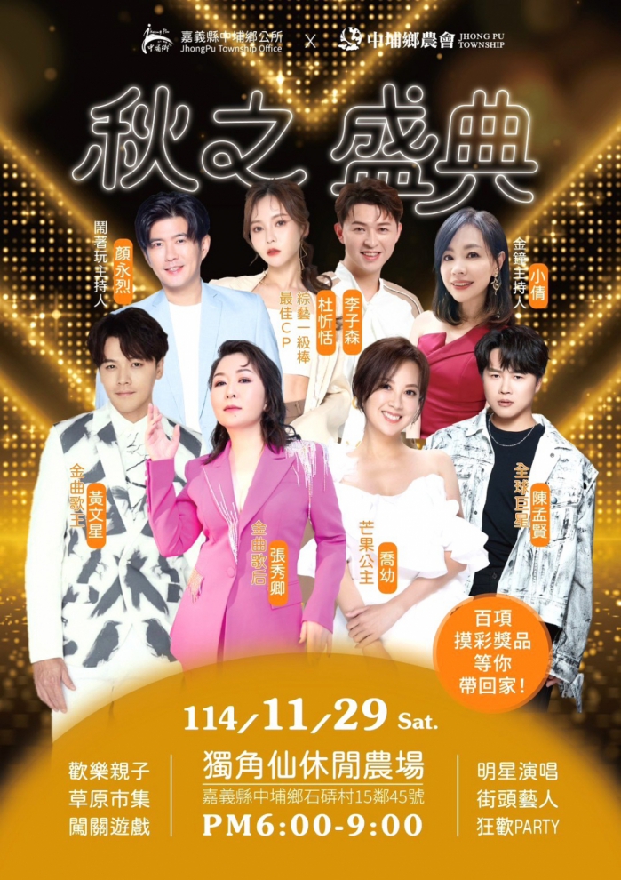 另外,從下午1點開始的草原市集,除有來自各地具有特色攤位外,中埔鄉農會供銷部、產銷班也會展售在地農特產品,家政班媽媽更是拿出最在地的好滋味,晚上5點舉辦農民節表揚活動,活動精彩千萬別錯過!