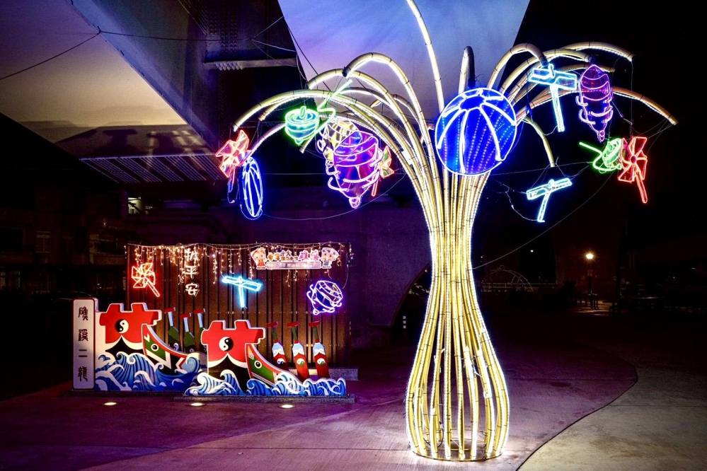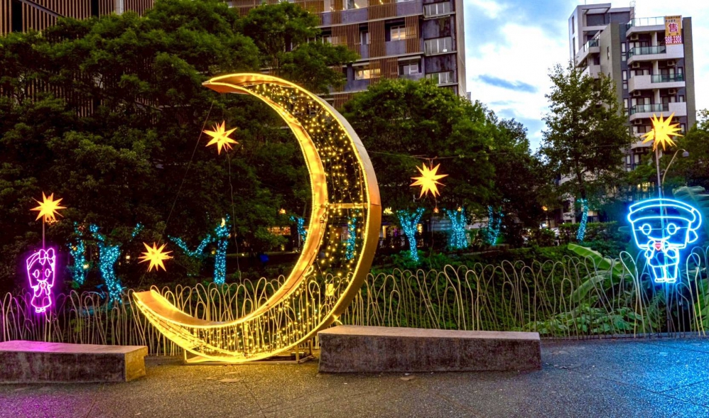 主燈座椅休憩區以溫泉湯為靈感,搭配水藍燈景與溫泉魚造型花燈,營造生命力與藝術氣息;主燈步道區以永續自然概念設計,運用樹枝燈片構築出交錯的光影廊道,彷彿自然的脈絡在夜色中流動,讓人流連忘返。