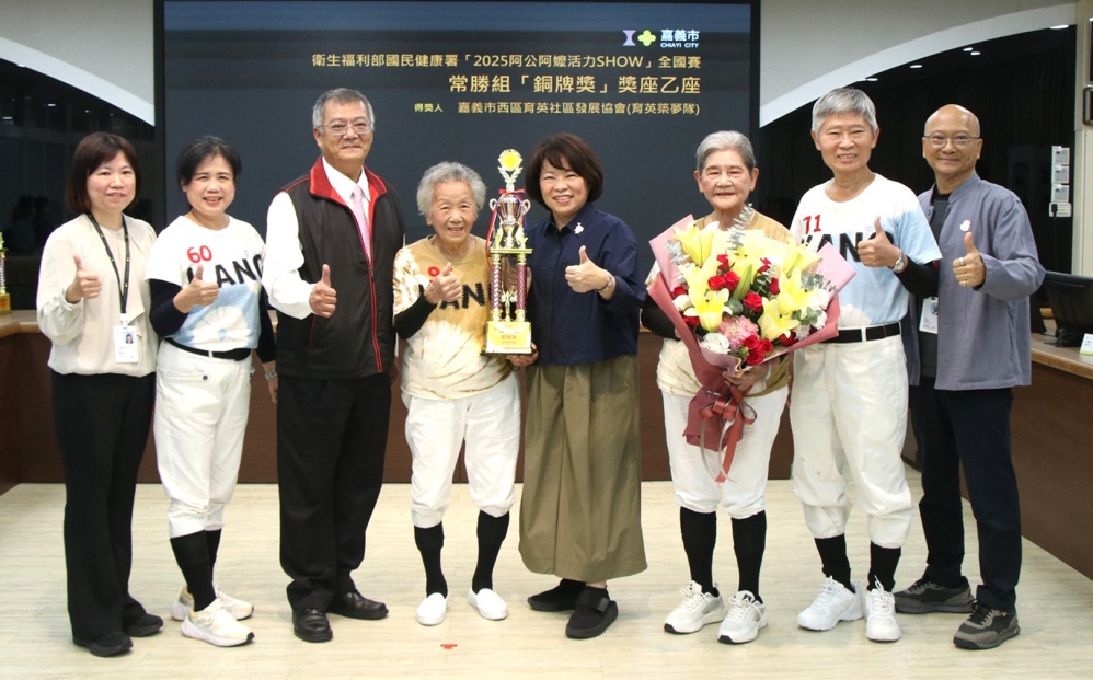 【雲嘉特派員陳信利/嘉義市報導】衛福部國健署於10月在新北市板樹體育館舉辦「長者活躍老化競賽」全國總決賽,匯集各分區金銀隊伍同場競技。嘉義市由育英里辦公處「育英火雞隊」及鳶尾花人文促進協會兩支代表隊出賽,雙雙奪下常勝組及新秀組銅獎佳績!