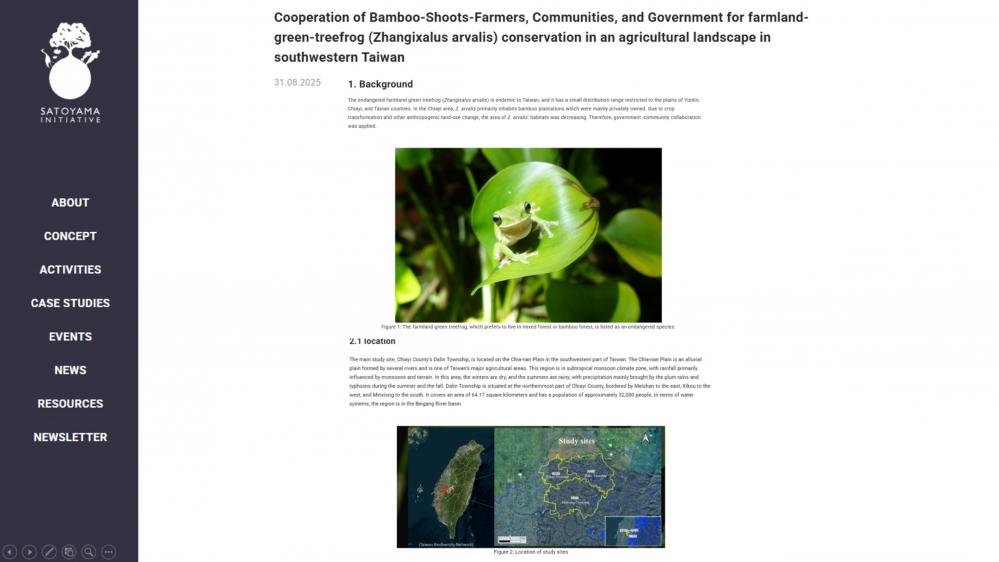 嘉義分署攜手嘉義地區筍農推出「諸羅樹蛙友善棲地管理標章」認證,並輔導「嘉義縣諸羅樹蛙友善蔬果生產合作社」運銷高品質又顧生態的標章竹筍到消費者手中,透過保育與農業經濟共好的方式,實踐「人與自然和諧共生」的里山倡議精神。IPSI 為聯合國生物多樣性公約(CBD)架構下的重要國際夥伴網絡,匯集全球各地政府、研究機構、非政府組織與社區團體,共同推動里山倡議。該平台所蒐錄的案例強調地方智慧與多方合作,嘉義分署的案例展現了臺灣在推動方面的具體實踐,並與世界各地的成功經驗相互呼應。