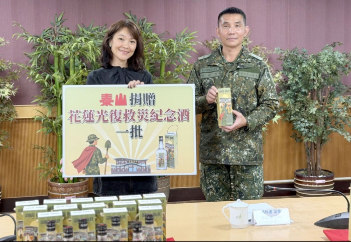 泰山致贈一批紀念酒給陸軍花東防指部,感謝官兵不眠不休投入搶險、撤離、清理任務,用行動守護家園,泰山副總鈕安澤表示,長達一個多月的救災,國軍弟兄和救難志工在花蓮災區日以繼夜身影,全民不分你我,「軍愛民「、「民敬軍」,讓國人深受感動。