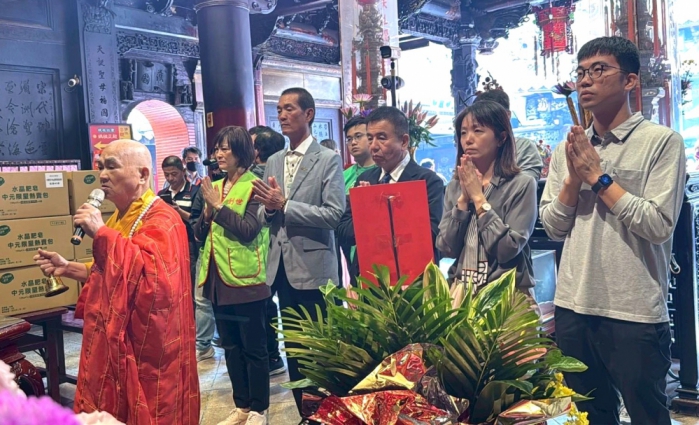 北港朝天宮董事長蔡咏鍀今天(10日)陪同南僑集團-皇家可口(股)公司高長慶副董事長、華強實業(股)公司營業部吳彥蓉經理、創世基金會李秀娟副秘書長等人登殿參拜,現場獻上超大金元寶,祈求媽祖護佑創世基金會「寒士吃飽30」活動順利。