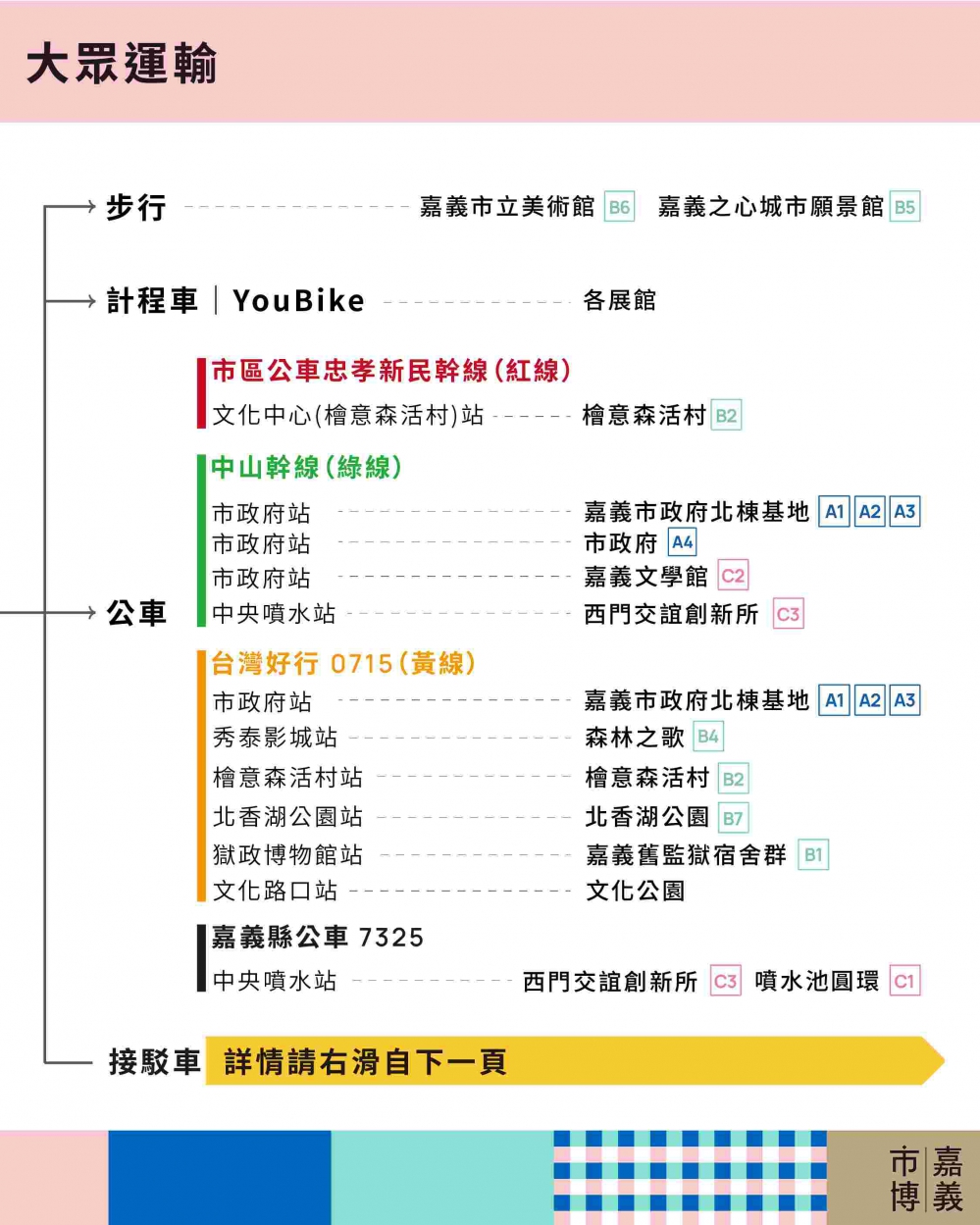 市政府為方便民眾前來參觀展覽及欣賞晚會,特別規劃交通資訊懶人包,提供民眾各個交通方式抵達嘉義市,並有完善的交通轉乘及接駁服務,相關資訊如下: