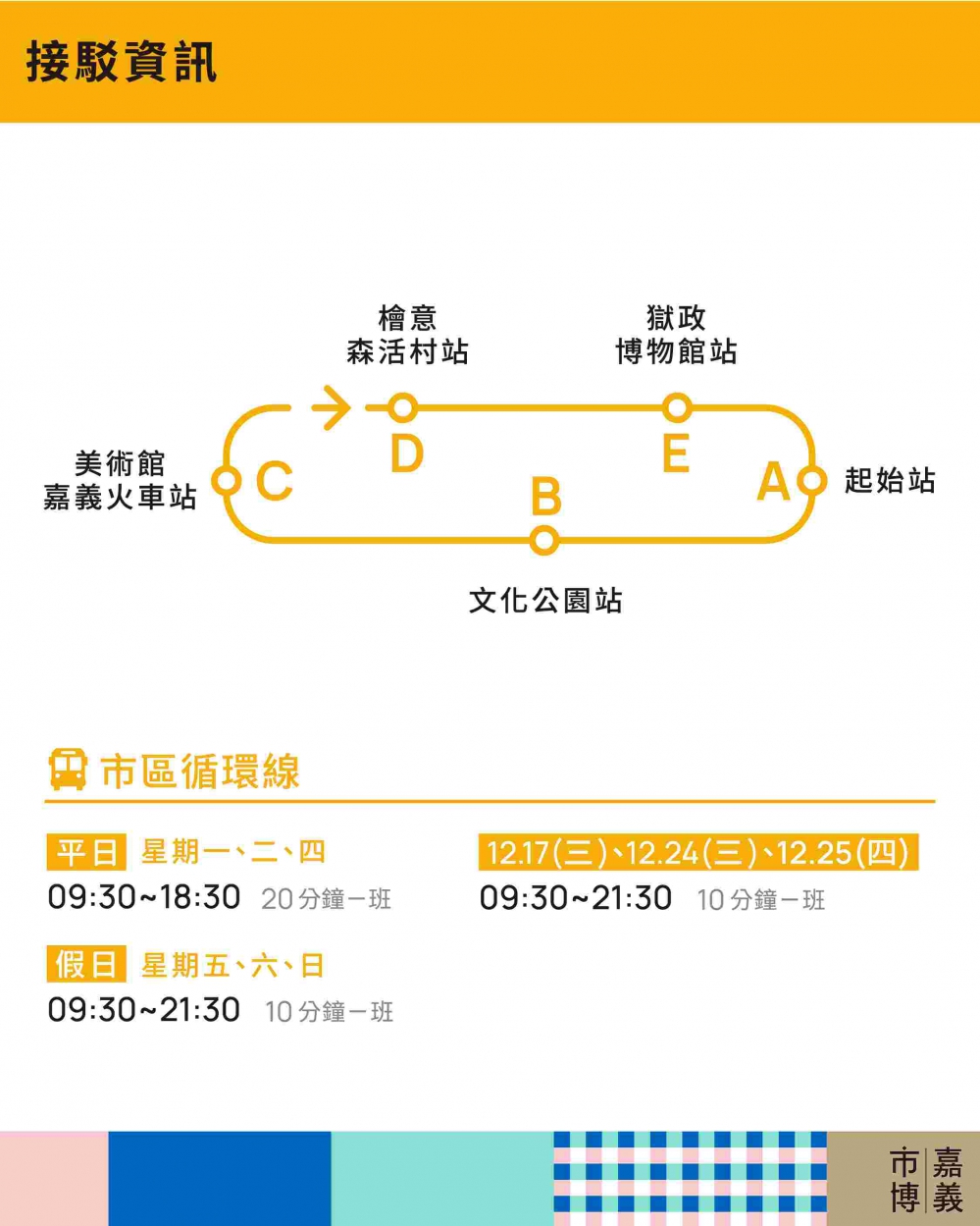 三、另為服務民眾可以順利至各展區參觀,活動期間有免費接駁車服務,採市區循環線行駛,由公明路總站發車後,中途設有「文化公園」、「美術館(嘉義火車站)」、「檜意森活村」、「獄政博物館」等,再回到公明路總站。