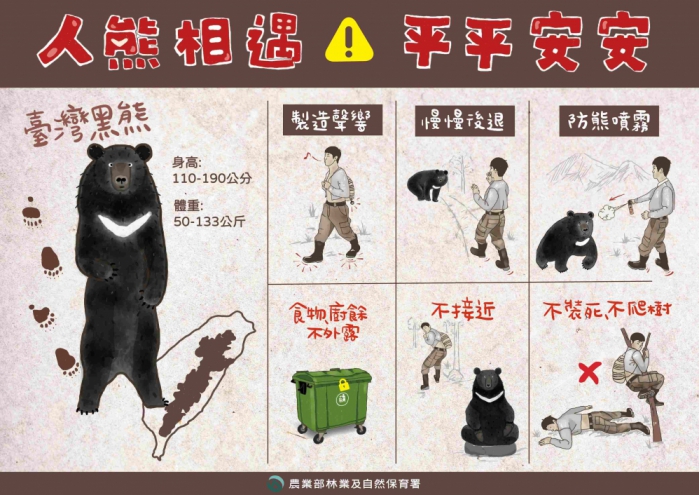 嘉義分署呼籲,民眾在登山前應先留意當地訊息是否有黑熊出沒紀錄,行進途中則建議配戴熊鈴或其他能發出聲響的裝備,以降低與黑熊意外接觸的風險;如前往有熊區域則建議隨身攜帶防熊噴霧,並置於隨手可及的位置,以便在緊急情況下能迅速應對;若真的遇見黑熊,切勿裝死或爬樹,應保持冷靜、面向黑熊並緩慢後退,避免刺激牠做出攻擊行為。