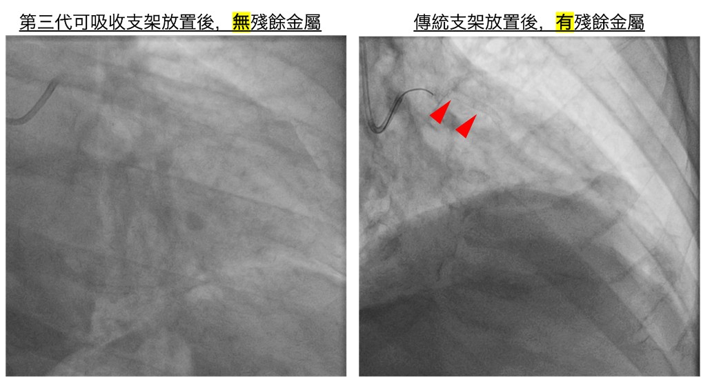 鍾主任強調,年輕患者若以傳統金屬支架治療,血管會因永久性金屬結構而失去自然舒縮能力。第三代鎂合金可吸收支架初期能穩定撐開血管,一年內約99%會被身體吸收,不會殘留異物或造成長期發炎,對保留未來血管健康十分有利。但前提須血管無嚴重鈣化、長度短、無大分支之情形,才能評估使用。